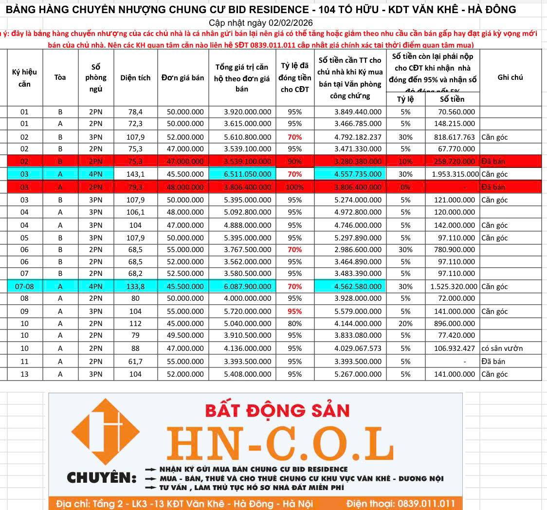 Xin chân thành cám ơn Quý khách đã quan tâm đến dự án Bid Residence (Tên cũ Dự án là Usilk City tòa CT1-104). Để được tư vấn chi tiết, gửi bán căn hộ, xem căn hộ thực tế và nhận bảng giá update mới nhất, Quý khách vui lòng liên hệ trực tiếp thông qua số điện thoại: 0839.011.011